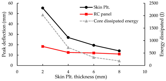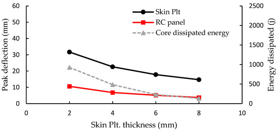 Peak deflections and energy dissipated with skin plate thickness variation for RC Panel with H-DCT cladding structure.