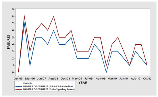 The signalling system is at present mostly affected by a limited number of causes, such as ‘heavy’ lightning, insulation failure due to passenger interference, interference by lizards, scrap material falling between the stock and tongue rails and cables being chewed by rats. The function of the railway signalling system basically depends on the different components of the signalling system. In this study, the failure data of the railway signalling system from Kharagpur to Balichak have been taken into consideration. The number of failures of different signalling systems and subsystems has been collected. As shown in Figure 1, the number of failures of the signalling system has been plotted from 2005 to 2010.