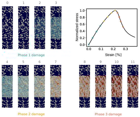 In this section, synthetic concrete mesostructures subjected to various levels of compressive loads are generated. The morphology of plain concrete is characterized by a distribution of coarse and fine aggregates (up to a volume fraction of 60–70%) that are embedded in a cementitious matrix (host) material. When concrete specimens are subjected to external loads, these aggregates induce highly disordered and complex stress and displacement fields. Under increasing loads, microcracks first initiate in the vicinity of the aggregates. These microcracks later coalesce to form localized macrocracks [