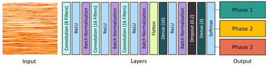The possible states of the concrete specimen correspond to three labels associated with each data point (coda signal) i.e., (1) Phase 1 damage, (2) Phase 2 damage, (3) Phase 3 damage. We use a feed forward Convolutional Neural Network (CNN)-based classifier. CNNs are a special type of Artificial Neural Networks (ANN) which are designed specifically to handle inputs with large dimensions. Traditionally, CNNs were designed to classify conventional visual images, in which the pixel data of an image is fed into the network in terms of an array. In our case, the time series data were reshaped into a 2D matrix by first slicing the series data into multiple parts and then arranging these parts into an array consecutively one row after another. Details of data processing, CNN architecture as well as the results are presented in the forthcoming subsections.