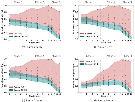 Figure 7 shows 4 different scatter plots of the normalized amplitude across the three damage phases. Each plot corresponds to a particular source location. The data in each plot is segregated according to the location of the receivers. A red background is applied to all data recorded by the receivers 1–9 (lie inside the damaged zone) and a green background is applied to all data recorded by the receivers 10–18 (see