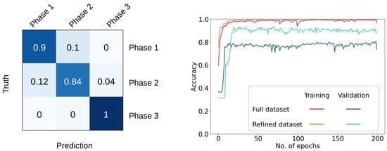 Figure 8 right shows the accuracy of the training and validation obtained from the full and the reduced dataset, using the same CNN architecture. We observed that the accuracy of the validation with the reduced dataset is approximately 90%, which is a significant improvement as compared to taking the full data set, where an accuracy of approximately 77 % was obtained and unsatisfactory prediction of Phase 2 damage (58% accuracy).