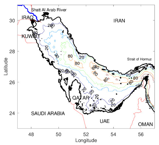 - Yao, F.; Johns, W.E. A HYCOM modeling study of the Persian Gulf: 1. Model configurations and surface circulation. J. Geophys. Res. 2010, 115, C11017. [Google Scholar] [CrossRef] [Green Version]