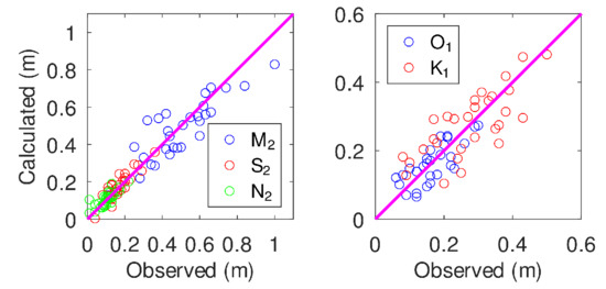 A two-dimensional depth-averaged model was used to simulate tides in the APG. Calculated elevations and currents were treated through standard tidal analysis [17], and tidal constants (amplitudes and phases) were then calculated and stored for each grid cell in the computational domain. Five constituents were considered: three semidiurnal (, and ) and two diurnal ( and ). The Eulerian residual transport was calculated to obtain tidal residual currents [18]. The tidal model was depth-averaged; thus, it provided averaged currents over the water column. A standard current profile was used to generate a vertical structure in the tidal current fields, since these currents decrease from sea surface to the bottom because of friction. Details may be seen in [17], for instance. A comparison between observed [19] and calculated elevations for the five constituents may be seen in Figure 2. If calculated values were linearly fitted to the observed ones, the respective coefficients for the , , , and constituents were 0.7471, 0.7786, 0.6218, 0.5557 and 0.5902. Agreement was generally good; higher discrepancies appeared at some locations, but they were most likely due to the relatively coarse resolution of the model: tides were simulated using the same 0.08 grid as used in the HYCOM model (see below).