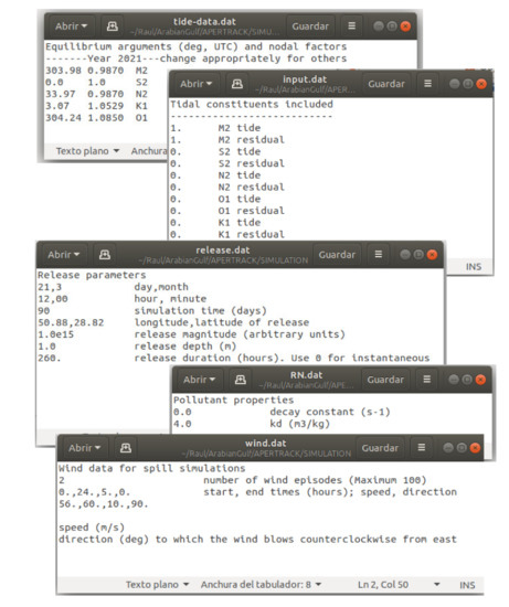 A number of files specify the release characteristics (date, time, position in geographic coordinates, depth, magnitude and duration) and simulation time, pollutant properties (decay constant and equilibrium distribution coefficient (which may be obtained from IAEA [16], as mentioned above), and, finally, an optional wind forecast (see next paragraph) and components of the currents to be used: tidal currents and residuals may be individually switched on and off (to allow comparisons if they are included or not in the simulations or to speed them up by removing tides in the calculations). These switches are provided in a specific file named input.dat. A list of the input files which should be modified for a particular simulation is given in Table 2.