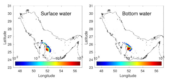 Here, some examples of the model performances are presented based on hypothetical releases. A release occurring near the coast, due to a ship accident for instance, was supposed to occur at a position with the coordinates 51 E, 26.5 N. The accident occurred at 12:00 hours local time on 15 September 2021. The surface spill lasted 168 h (one week) and 30 days were simulated. The magnitude of the spill was arbitrarily fixed as units. In the first experiment, a stable chemical pollutant (that is non-radioactive and does not experience any other decay process, such as as biodegradation, for instance, i.e., decay constant set to zero) was considered.
