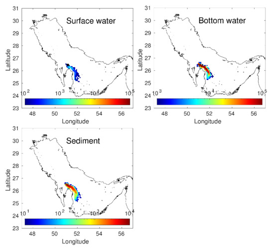 In a second experiment, exactly the same hypothetical accident was simulated, but it was supposed that the released contaminant was Hg, a toxic heavy metal whose distribution coefficient is equal to 30 m/kg [16]; thus, it presents a high affinity to be fixed to the sediments. The results of this simulation are presented in Figure 5, where a map showing the calculated concentrations in sediments (units/kg) is added. Due to the metal adsorption on the sediment, concentrations in the surface water are lower than in the case of the dissolved pollutant (note that the magnitude of the release is the same in both cases, as well as color scales in Figure 4 and Figure 5). In addition, pollutants with high affinity to the sediments are more immobile than those remaining in solution. This can be clearly seen by comparing the distributions in the bottom water layer: in the case of Hg, the peak concentrations remain in the area near the spill location.