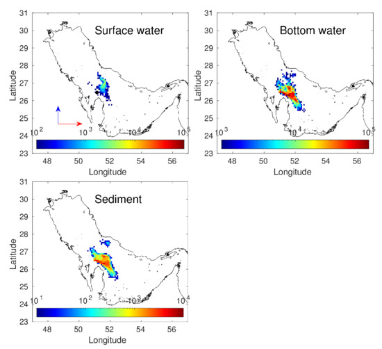 A final numerical experiment was carried out to illustrate the effects of a local wind due to a local storm, for instance. The Hg simulation previously described was repeated, but it was considered that during the first 5 days, a 5 m/s was blowing from the west, which then increased speed to 20 m/s and changed direction to a northward wind. The results are presented in Figure 6. Obviously, the pollutant was initially transported to the central APG due to the west wind, and later, there was a significant transport to the north caused by the south wind. Actually, some Hg approached the eastern coast of the APG, and a spot of contaminated sediment was apparent there.