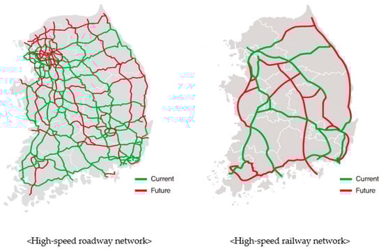 This study applied the proposed methodology over all of South Korea, which has a population of about 50 million. It has seven metropolitan cities and eight provinces and can be subdivided into 250 Traffic Analysis Zones (TAZs). The government of South Korea is considering a long-term investment plan to increase from 50 to 80% the number of people able to travel over all the regions within three hours by 2040 (MOLIT, 2021). According to this plan, the current highway will be expanded from 4848 to 6750 km, and the railway from 5366 to 7599 km. For the railway, the construction of semi-high-speed rail is a significant portion of the investment. Current and future intercity high-speed roadway and railway network of Korea are shown in the below Figure 1.