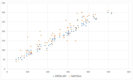 Before the analysis of consumer surplus, this study investigated travel times by different methods of estimation. This study estimated travel time using three methods: EMME 4, MATsim, and open API. The results showed that the distributions of average travel time were comparable. However, although the origin and destination were identical, the estimated travel time using MATsim and open API (Daum [27]) were slightly different as shown in Figure 2. In this figure, the horizontal and vertical axes indicate the travel distance and the travel time, respectively.