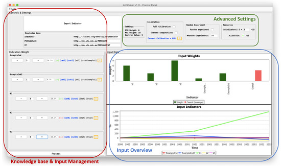 As shown, it includes three different sets of components for (i) the management of the input knowledge and of the knowledge base, (ii) advanced settings and (iii) input overview. The first set of functionalities aims to import the input datasets and to check/manage the associated semantics. Advanced settings are related to weights, calibration and the management of weights in terms of resources for decision making (e.g., establishing constraints). Finally, the last component provides a concise overview of the current input.