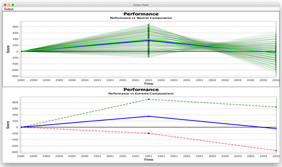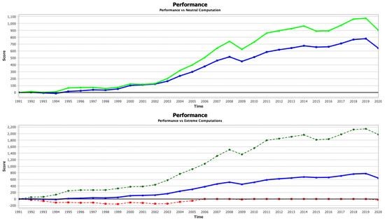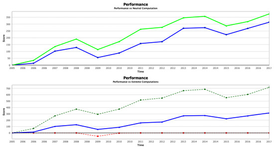 Figure 14. Analysis result (Case Study 2). The system performance is represented by the blue line, while the continuous green line refers to the neutral computation. Dashed lines are extreme computations.