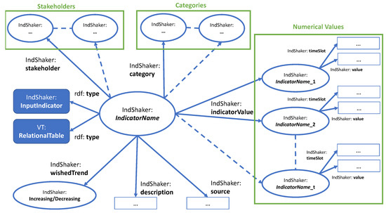The core specification assumes each indicator defined as the integrated description of numerical values with related semantics. The latter includes functional semantics (e.g., the wished trend), typical metadata (e.g., description and source) and other characterizations, such as associated categories and stakeholders.