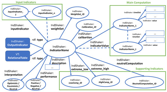 An output is still considered an indicator, but it is associated with the more fine-grained concept of OutputIndicator as per the proposed ontology. In the current version, the semantic structure includes a link to the input, including indicators both with the weight-set and the calibration details used for computations. A qualitative description of the output is reported through the properties performance and interpretation, while the numerical result of the main computation is integrated with a number of supporting indicators—i.e., neutral computation and extreme computations.