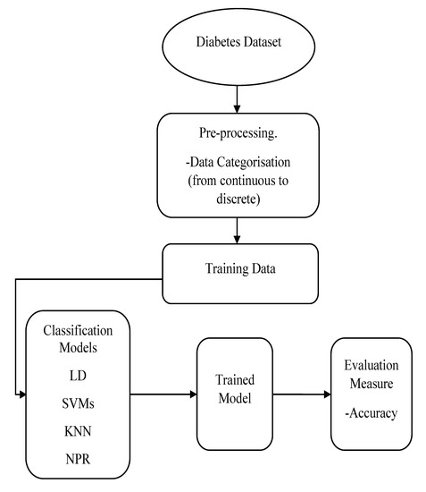 - Abdulhadi, N.; Al-Mousa, A. Diabetes Detection Using Machine Learning Classification Methods. In Proceedings of the 2021 International Conference on Information Technology (ICIT), Amman, Jordan, 14–15 July 2021; pp. 350–354. [Google Scholar]