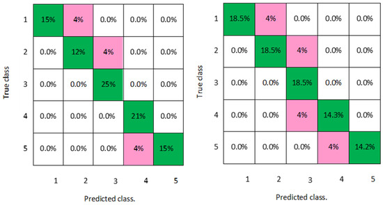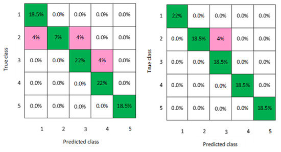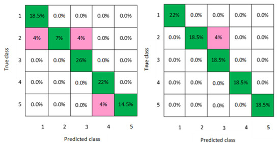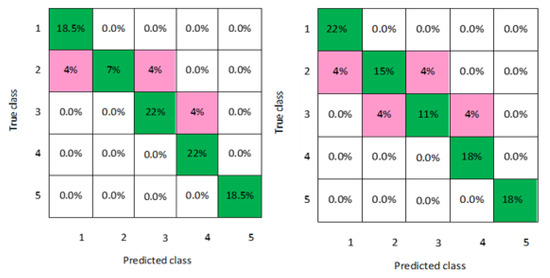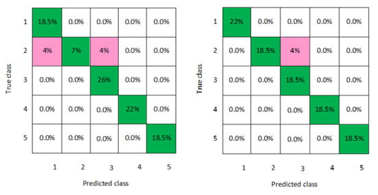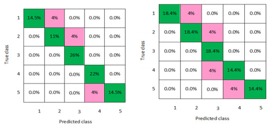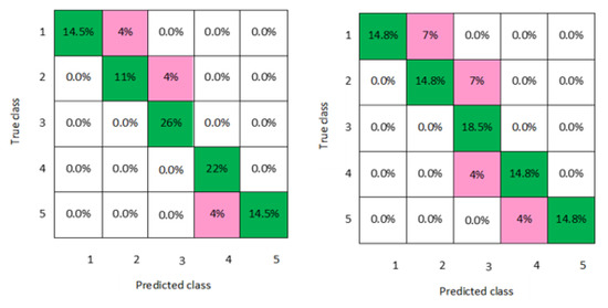 In addition, a graphical representation of the confusion matrixes of the classification models is clearly displayed in Figure 2, Figure 3, Figure 4, Figure 5, Figure 6, Figure 7 and Figure 8 for both men and women datasets, respectively. For each model, the diagonal green squares represent the correct prediction ratio of the predicted classes over true classes, while the red squares give the incorrect class ratio. The results show the level of the decision ratio between the true value and the predicted value. Figure 2 shows the confusion matrix of the predicted and true class categories obtained by the LD model; for the men data, 0.09 of the data were misclassified for the following classes (class 1, class 2, and class 3). For the women data, 0.12 of the data were misclassified for class 2 and class 3. So, the overall classification accuracy of the LD model was 88.9% and 85.2% for the men and women datasets, respectively. Figure 3 shows the maximum misclassification among models obtained by LSVM; 0.09 of the data were misclassified for both men and women data for the classes 1, 2, 4, and 5, which gave an average classification accuracy of 83.4% for the men and women datasets. Figure 4 and Figure 5 demonstrate the confusion matrixes of the predicted and true class obtained by quadratic SVM and cubic SVM for men and women, respectively; as can be seen, 0.21 of the data were misclassified for both models for men and women data for the classes 1, 2, 4, and 5, with a classification accuracy of 88.9% for both models for men and 85.2% for both models for women, respectively. Figure 6, Figure 7 and Figure 8 present the confusion matrixes of the best performing classifiers, Gaussian SVM, fine KNN, and weighted KNN; the misclassification of class ranged between 0.03 and 0.11 for all models for men and women, with an average classification accuracy of 93.8% for men and women datasets.