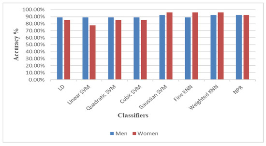 All classification methods were compared according to their accuracy as shown in Table 4 and Table 5 for the men and women datasets, respectively. For the men data in Table 4, Gaussian SVM, weighted KNN, and neural network pattern recognition models gave the same accuracy (92.6%), which was the highest value achieved among the models. The remaining models also performed well, with a similar accuracy of 88.9%. Table 5 provides different accuracies given by models when applied to the women data. The highest accuracy was given by Gaussian SVM, fine KNN, and weighted KNN models of 96.3%, followed by neural network pattern recognition with an accuracy of 92.6%. Additionally, three other models had good performance with the same accuracy of 85.2%: linear discriminant, quadratic SVM, and cubic SVM. Lastly, the linear-SVM-based model had the lowest accuracy of 77.8%. In addition, Table 4 and Table 5 also show a comparison of classifiers in terms of prediction speed (the number of observations processed per second during the validation of the model) and training time. It is clearly shown from Table 4 and Table 5 that weighted KNN model was the fastest with the highest prediction speed of 310 obs/s and 340 obs/s for the men and women datasets, respectively. On the contrary, linear SVM was the slowest with 77 obs/s and 110 obs/s for the men and women datasets, respectively. The maximum training time was taken by linear SVM with 10.177 s and 5.4628 s, while the weighted KNN took the least training time of 1.2459 s and 1.6991 s for the men and women datasets, respectively. Overall, among all classifiers, the weighted KNN model performed well in terms of accuracy, prediction speed, and training time for both the men and women datasets.