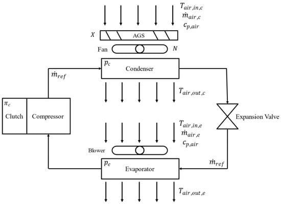 where and are the refrigerant pressures in the condenser and evaporator, is the compressor clutch engagement (on/off), is the rotational speed of the condenser fan, is the open-fraction of the AGS, is the refrigerant mass flow rate, is the volume flow rate of the air from the blower fan, and are the inlet air temperatures to the condenser and evaporator, is the inlet enthalpy to the condenser, and is the vehicle speed. Models for and based on the behavior of the refrigerant are described in Section 2.4. Since the intended usage of the model is within a control scheme to reach the target cabin temperature with minimum energy consumption, we also develop models of the energy consumption of the overall A/C system, including additional drag due to underhood flow, in Section 2.7. The inclusion of the impact of the AGS on underhood airflow and of the increase in power consumption associated with drag caused by that underhood flow are the key advancements over the state of the art presented in this paper.