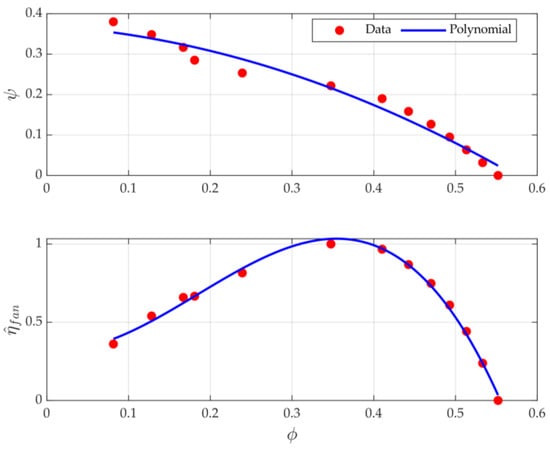 where is the flow coefficient, is the pressure rise coefficient, and are the axial and midspan blade speeds, is the cross-sectional flow area of the fan, is the rotational speed of the fan in rotations per minute, and is the midspan radius of the fan. Two polynomial equations were developed using a least-squares regression method to fit polynomial equations to the nondimensionalized experimental data, shown in Figure 2. In Figure 2, the fan efficiency has been normalized using the highest fan efficiency provided in the experimental data.