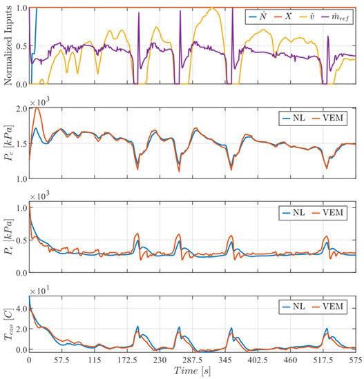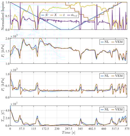 The ultimate intended use of the NL model is within control frameworks that require an analytical plant model. However, the application to control is outside the scope of this paper. The VEM model has been developed and validated by the industrial partner using experimental data gathered from testing on the real physical vehicle. The industrial partner’s VEM model has been developed under best practices from the literature [13,14]. In this paper, the VEM model acts as a substitute for an actual physical vehicle for controller development; the output from the VEM model is treated as the output from the physical vehicle. Thus, the nonlinear models in this paper are validated against the VEM model. Recall that the focus is on the approach, which is general, rather than the specifics of the VEM and NL models, which are specific to a particular vehicle. The reference system could just as easily be measured data from a vehicle; this would have no impact on the development, tuning, and assessment of the NL model.