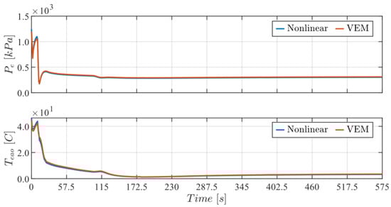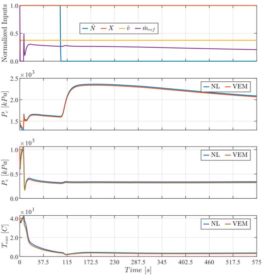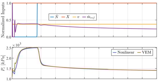 The normalized RMSE and maximum errors between the VEM and NL model signals shown in Figure 4 are displayed below in Table 2 and Table 3, respectively, demonstrating the NL model’s ability to handle transients arising from the inputs. It can be observed from Figure 3 and Figure 4 that the spikes in the refrigerant mass flow rate yield the greatest local error between the NL and VEM behaviors, causing the normalized RMSE to increase.