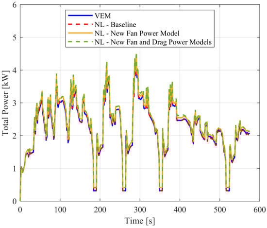 The power consumption of the A/C system was assessed for the same driving conditions used to obtain the results displayed in Figure 3. To show how the power consumption assessment of the A/C system has been developed through this work, three comparisons are made: the power consumption of the VEM model, which only measures the compressor and fan power; and the power consumption of the NL model using the same fan power model present in the VEM model, the power consumption of the NL model using Equation (11) for the fan power, and the power consumption of the NL model using Equations (11) and (14), including the additional drag power. These comparisons are shown in Figure 7.