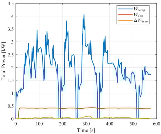 The compressor power consumption is driven by the mass flow rate of the refrigerant, which has a very strong impact on the compressor power, as can be seen. The impact of the volumetric airflow rate on the fan and additional drag power can also be seen. For the SC03 cycle shown in Figure 8, the fan speed and AGS positions are at their maximum physical values of 2500 rpm and fully open, respectively. Thus, any changes in the front-end airflow are caused by the vehicle speed, meaning the variations in the fan power and additional drag power observed in the figure are due to the change in vehicle speed.