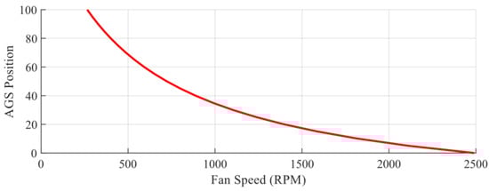 Figure 9 depicts the combinations of AGS position and fan speed inputs to maintain a constant underhood flow rate of 450 cfm and the power consumption associated with the fan and drag. In this driving condition, the power consumed by the fan is clearly much greater than the power consumed due to additional underhood drag. The same analysis was conducted for conditions where the drag power was more significant, specifically when the vehicle speed was much higher. The same findings were observed for these scenarios, where the fan power dominates the additional drag power. Figure 9 demonstrates that the same underhood airflow rate can be achieved using various combinations of AGS and fan inputs, but the power consumed is not constant. By opening the AGS, allowing more air to flow through the vehicle’s front end, the fan can reduce its rotational speed to achieve the same cooling flow but at reduced power consumption. This will be useful for control implementation where cooling performance and power consumption reduction are of interest.