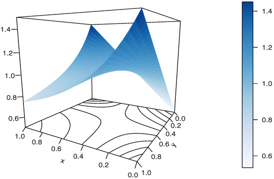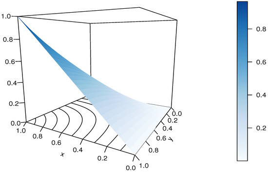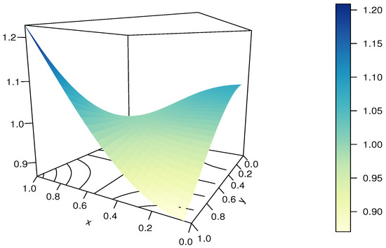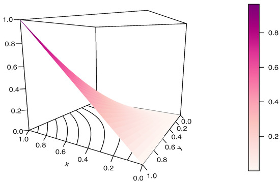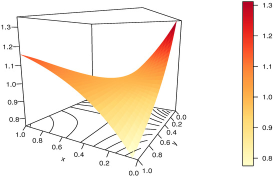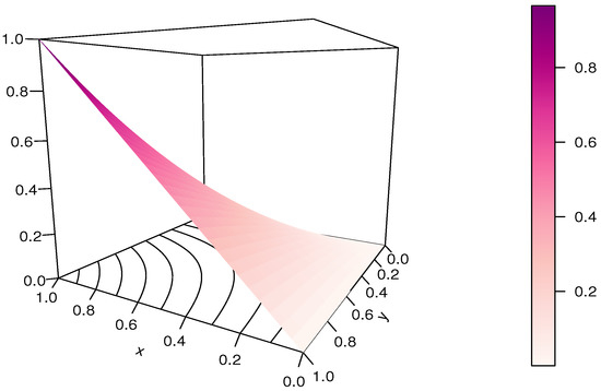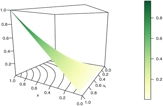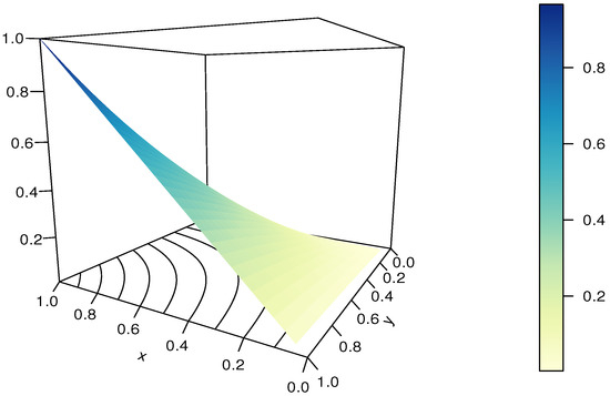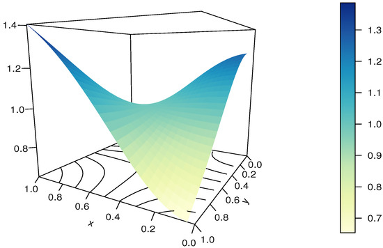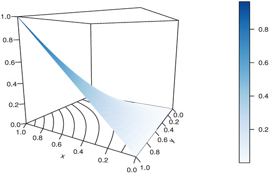It should be noted that the RP-FGM product copula is not diagonally symmetric, and . It can be viewed as an extension of the FGM copula thanks to the presence of , but it does not cover it as a special case since .