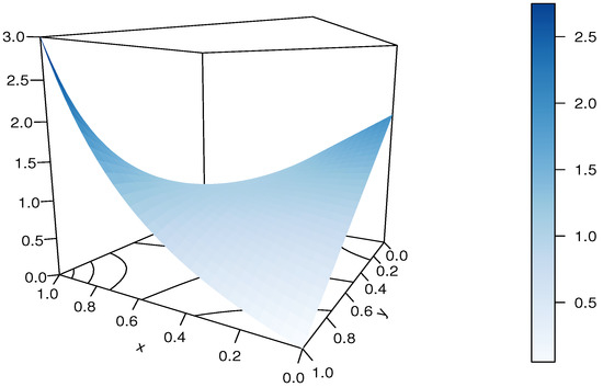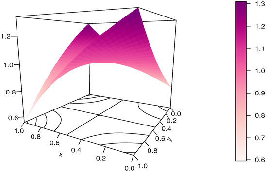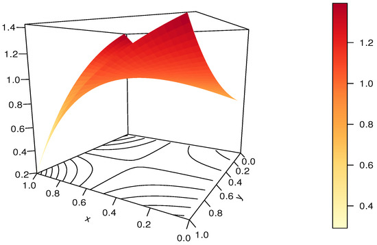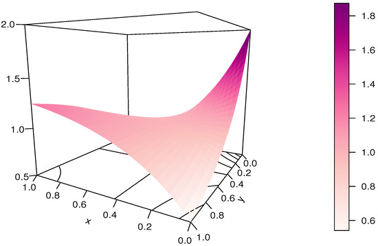 For the purpose of this paper, the copula defined in Equation (4) is called the ratio-polynomial (RP) copula. Plots of the RP copula are presented in Figure 1 and Figure 2, for and (arbitrarily chosen in the admissible domain), respectively.
