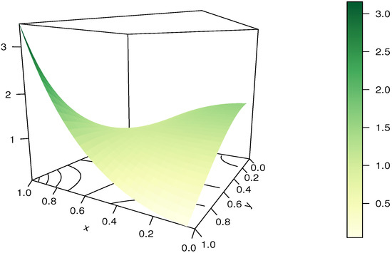 where denotes the first order partial derivative with respect to y, and the same when we substitute y by x. The main interest of this product is that is a valid copula, opening the door to various forms based on diverse combinations of and . We refer to [26], and the references therein. Here, some closed-form expressions are demonstrated by taking .