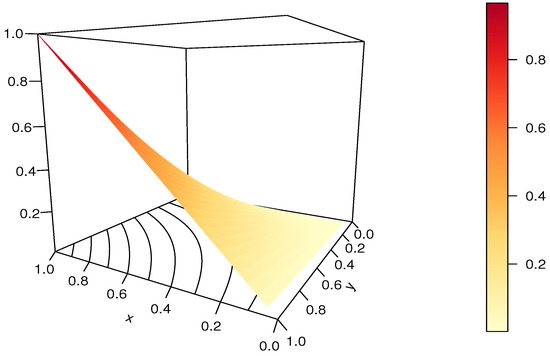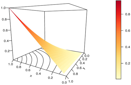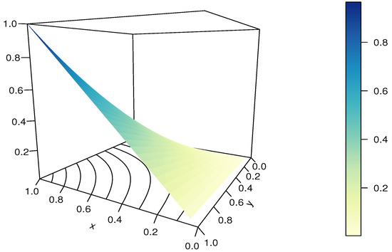 Now, some essential features of the RL copula are explained. Clearly, the RL copula is diagonally symmetric because for any . It is not Archimedean, since, for (for instance); the associativity condition is violated since