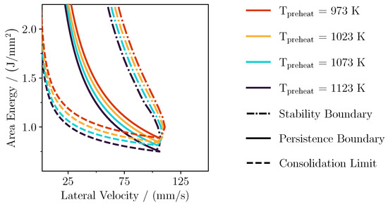 Figure 3 shows the calculated processing boundaries and the resulting processing map for different preheating temperatures, ranging from 973 K to 1123 K. With an increasing preheating temperature, the consolidation limit shifted towards lower area energies and lower lateral velocities. The same trend could be observed for the persistence boundary and the melt pool stability limit boundary. As a consequence, the location of the whole processing map shifted towards the lower left of the process parameter space.