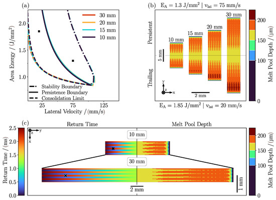 Processing boundaries for different scan lengths of 10, 15, 20, and 30 mm (a) for area energies of 0.6 J/mm2 to 2.2 J/mm2 and lateral velocities of 2.5 mm/s to 149.5 mm/s with a line offset of 100 μm, preheating temperature of 1023 K, and beam diameter of 200 μm. Corresponding melt pool depth distributions (b) for a parameter combination in the trailing regime with 1.85 J/mm2 and 20 mm/s (bottom) and in the persistent regime with 1.3 J/mm2 and 75 mm/s (top) for each line length. Local return times and local melt pool depth distributions (c) for two different line lengths for the first process parameter combination. The local return time, as well as the magnitude of the turning point effects, remained constant, but are scaled according to the line length.
