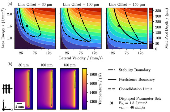 The effect of different line offsets of 30 μm, 100 μm, and 150 μm on the melt pool depth distribution and the resulting processing boundaries is depicted in Figure 6a. At lower lateral velocities, the melt pool geometries emerging from a process parameter combination with a higher line offset exhibited a significantly higher melt pool depth and led to a shift of the consolidation boundary towards lower area energies and lateral velocities for higher line offsets. With increasing lateral velocities, however, this trend diminished. A higher line offset also led to a shift of the persistence boundary towards higher energy inputs and lateral velocities and, therefore, resulted in a larger trailing melt pool region. In contrast, the location and shape of the melt pool stability limit remained comparatively constant. Only the characteristic curvature at high lateral velocities shifted, along with the persistence and consolidation boundary, towards lower energies and higher lateral velocities for higher line offsets. While the persistent region of the processing map elongated towards higher lateral velocities and lower area energies for higher line offsets, it simultaneously narrowed, due to the shift of the persistence boundary towards the upper right of the process parameter space.