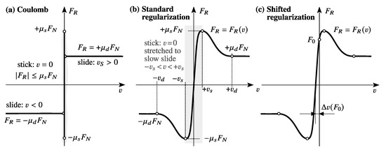 Dry friction: (a) Coulomb’s approach, (b) regularized approximation, (c) shifted regularization.