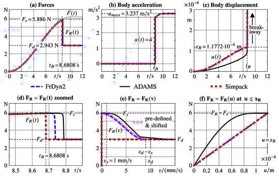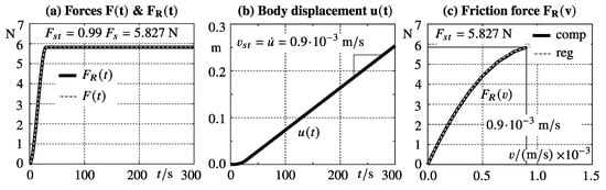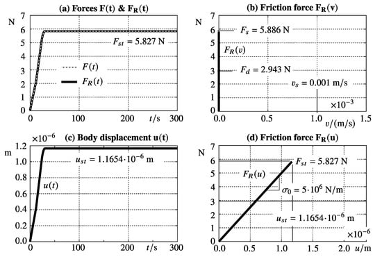 Figure 5b,c illustrate the break-away effect at by the time histories of the body acceleration and the body displacement . All friction models under consideration approximate sliding at by a constant friction force . Viscous components in the friction force are not considered here. The free body diagram in Figure 2b delivers the linear momentum