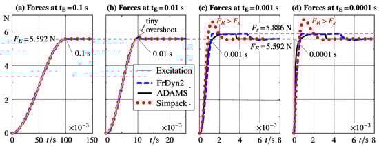 A pulse load excitation, performed in [4], revealed the tendency of dynamic friction models to produce dynamic overshoots in the friction force time histories. That is why the virtual test-bench defined in Figure 2 is now exposed to excitation forces where the amplitude is 5% less than the static friction force and the step duration is varied from to . The corresponding simulation results are shown in Figure 6. The solid thin gray line represents the excitation force , the dashed blue line, the solid black line, and the dotted red line mark the friction forces computed with the FrDyn2, the Adams stick–slip, and the Simpack stick–slip models.