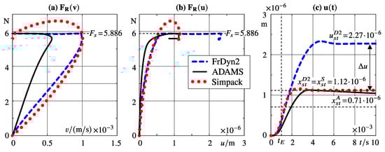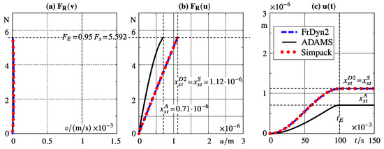 The forces generated by the friction models depend here practically not on the velocity but only on the displacement of the body u, as seen in Figure 7a,b. In case of the FrDyn2 and the Simpack stick–slip models holds, which provides the friction force at the steady state displacement , as indicated in Figure 7b,c by thin dashed black lines. Adams models the friction force a quasi-static sticking mode by a strongly nonlinear and degressive function of the displacement. The Adams manual does not specify this function but the simulation results provide the friction force at the steady state displacement , as seen in Figure 7b,c. As expected from the time histories plotted in Figure 6a, the time histories of the body displacement reach their steady state values and at without any overshoots, as seen in Figure 7c.
