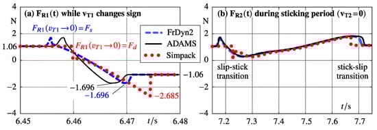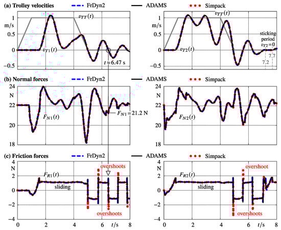 In the very short time interval , the normal force between trolley 1 and the rail amounts to , as indicated in Figure 11b. The friction values defined in Figure 10 provide in this case a static friction force of and a dynamic friction force of . At times and , the first trolley is in a full sliding mode, as indicated in Figure 12a by the friction forces and . These sliding modes are perfectly reproduced by the friction models under consideration. Shortly before the sign change in the trolley velocity, the friction forces computed by the FrDyn2 and the Adams stick–slip model make use of the Stribeck effect, which models a velocity-dependent transition from the static to the dynamic friction force and vice versa. The Simpack stick–slip model approaches with the dynamic force value and does not reproduce a potential velocity-dependent increase in the friction force. The FrDyn2 and the Simpack stick–slip models describe the friction force at by a linear spring, whereas the Adams stick–slip model uses a nonlinear approach. That is why, the FrDyn2 model (dashed blue line) corresponds in the time interval more to the Simpack (dotted red line) than to the Adams stick–slip model (solid black line). The friction forces of the FrDyn2 and the Adams stick–slip models are limited to the static value , which results in at . However, The Simpack stick–slip model overshoots and produces the peak value of , which exceeds by nearly 60% the static friction force or , respectively.