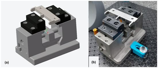 Representation of the fixture: (a) The 3D CAD model of the fixture with the workpiece in CREO Parametric software. (b) Fixture with the workpiece in the real environment.