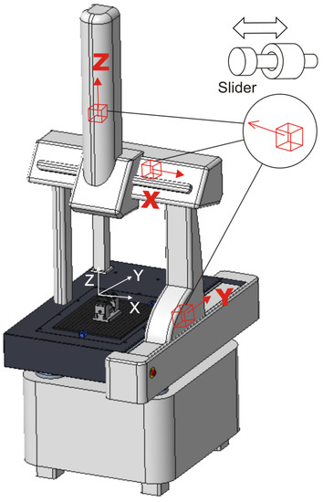 Based on previous experience in configuring virtual machine tools [14] and virtual CMM [15,16], virtual CMM in this paper is configured. For the purposes of simulating of the virtual CMM in the programming system, it is necessary to configure the machine according to the appropriate kinematic structure as well as the appropriate kinematic links. The required kinematic links for the considered CMM are three translations using a slider-type connection, Figure 4.