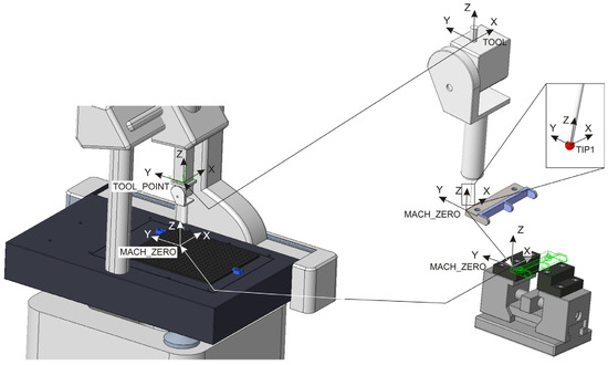 After defining the kinematic connections of the moving parts of the machine, it is necessary to establish a connection between the coordinate systems of the workpiece and the measuring probe on the one hand and workpiece and virtual CMM on the other hand within the CAD/CAM system used (PTC Creo). On the machine, coordinate systems MACH_ZERO are defined on the work table, and TOOL_POINT is defined on the front side of the sensor’s head. MACH_ZERO is also defined on the workpiece and fixture. On the measuring probe, the TOOL coordinate system is defined, which is used to place the measuring probe on the machine by matching it with TOOL_POINT coordinate system. Additionally, the coordinate system in the center of the measurement sensor sphere, referred to as TIP1, is used to generate the measurement path. By aligning the appropriate coordinate systems, the virtual workpiece, fixture and measuring probe are placed on the virtual CMM, as shown in Figure 5.