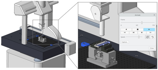 In addition to the CMM, the fixture used in the real inspection was also modelled. It consists of a stationary base, a movable platform, a nut, and clamping jaws. The finalization of the modelling of the measurement system was achieved by creating a prismatic part on which the inspection will be performed.