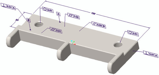 Metrological analysis includes the analysis of required tolerances of form and position, the measurement plan, clamping plan, sequence of measured characteristics, configuration of measurement probes, and ultimately the programming of the measurement paths [17]. In the context of form and position tolerances, we refer to flatness, straightness, concentricity, cylindricity, parallelism, perpendicularity, and symmetry. The technical drawing directly defines and predetermines the surfaces or features (planes, cylinders, circles, lines) that are considered for inspection in order to create the necessary measurement paths and generate a measurement plan. The measurement plan is directly related to the sequence of measured characteristics on the part, as ultimately it is necessary to measure all the required characteristics with the shortest possible path. In this sense, it refers to the measurement efficiency of the process itself.