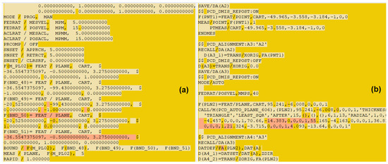 Output DMIS code: (a) Display of a portion of the DMIS code from PTC Creo Parametric 5.0 software. (b) Display of a portion of the code from PC–DMIS software.
