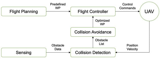 This work aims to address parts of a comprehensive obstacle detection and collision avoidance system, thereby representing a two-stage “sense” and “avoid” problem. The generic Sense and Avoidance (S&A) system architecture is depicted in Figure 1. Notice that the outcome of the system is to feed updated flight trajectory information to the flight controller, such that the UAV can continue to navigate safely. This all starts with the sensing system, so its definition and performance are critical.