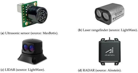 The next subsections describe the models of active non-cooperative sensors: the ultrasonic sensor, the laser rangefinder, the LIDAR (Light Detection and Ranging) sensor, and the RADAR (Radio Detection and Ranging) sensor. These are illustrated in Figure 2, and are followed by a comparative analysis, as shown in Table 1. Certain models were developed by [24] and are further adapted to the present work.