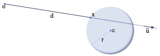 where is the detection point on the line and/or sphere, is the center point of the sphere, r is its radius, is the unit vector that defines the line direction in space, and d is the distance from the origin of the line . Combining both equations leads to an easily solvable quadratic equation,