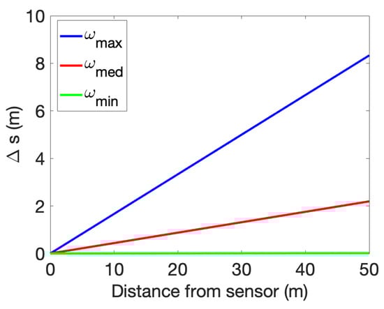 The LIDAR model in use (based on the LightWare’s SF45/B) has a specific update rate, but it is possible to set its angular velocity (scanning speed) up to a maximum of 6.3 rad/s. However, by choosing faster sweep speeds, the arc of circle that is not being detected between each measurement increases, thus increasing the likelihood of missing an obstacle smaller than that arc. This effect is illustrated in Figure 6, where the length of the arc traversed varies analytically with the distance to the sensor and the angular velocity. At maximum scanning speed (), this 45 m range LIDAR might not detect obstacles that are smaller than 8 m wide at this distance. However, if covering a larger area quickly is more important, sacrificing some visibility at the maximum range might be acceptable. Ultimately, the compromise should be based on the specific needs and constraints of the system.